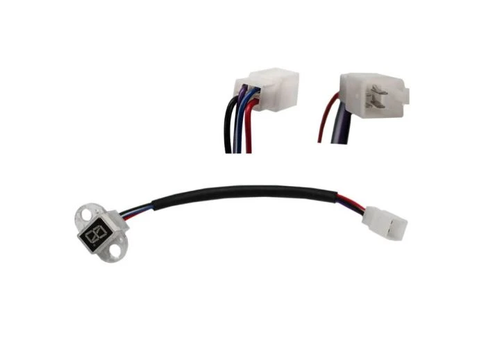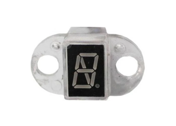 The gear indicator display for TaoTao ATK125A, GK110, Jeep Auto, and Targa 150 go-karts is a plastic indicator with a poured resin back connected to a 4-wire harness and 4-spade male connector